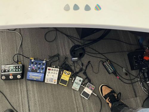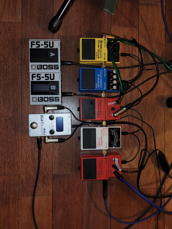 Alors me concernant pour la basse, quelques pédales modifiées pour s'insérer au plus juste dans un espace confiné :