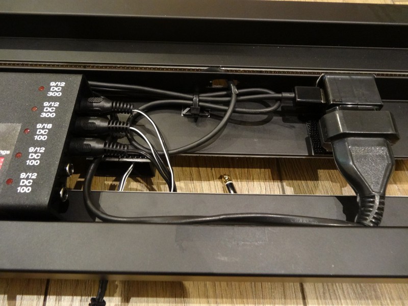 Comme le tube est creux je l'utilise également pour y faire cheminer proprement un max de trucs (des câbles d'alim mais aussi le jack qui servira à connecter les 2 rangées de pédales).