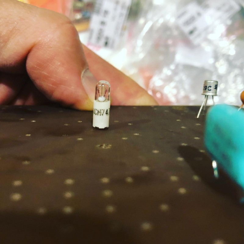 Du coup je m’en fabrique une deuxième avec un pcb vintage, une vieille lampe chicago miniature 12V40ma Nos.
