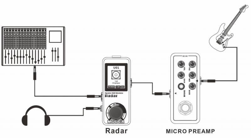 Avec ces switchs, je peux donc choisir le préampli (un de mes 4 Mooer ou celui de ma tête Engl), profiter dans les deux cas des effets de modulation et derrière choisir le baffle en sortie (baffle de mon ampli ou baffle de mon choix via la Mooer Radar). Ca permet donc toutes les combinaisons possibles.