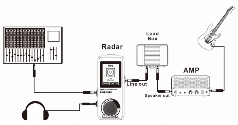- Sortie baffle de l'ampli => Load Box => Radar => Table de mixage ou carte son