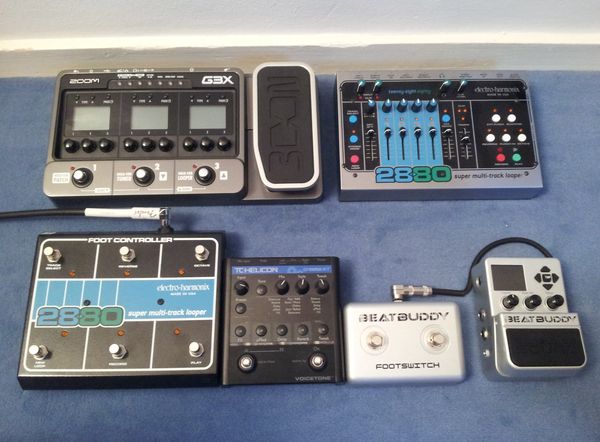 sur ce pedalboard, la synchro midi avec la boite à rythme permet d'avoir des boucles de looper et des parties rythmiques parfaitement synchronisées, même quand on lance des breaks et changements sur la Beatbuddy (qui est faite pour ça, cette boite à rythme méconnue est une tuerie), c'est donc très vivant, ça change tout le temps, ça bouge, ce qui est rare avec les loopers...