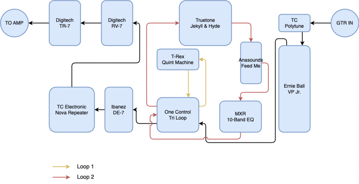 des interférences bizarres, même quand elles sont éteintes et que le volume de la guitare est coupé. je soupçonne des buffers pourris. Ceci dit, ce qui m'intrigue le plus, c'est que mes problèmes de bruit sont beaucoup plus marqués uniquement quand le switcher que je veux utiliser se trouve quelque part dans la chaîne (soit avant ou après l'une des pédales incriminées, soit dans une des boucles du switcher). J'ai aussi un autre bruit si j'allume une Truetone Jekyll & Hyde qui est dans l'une des boucles : j'ai