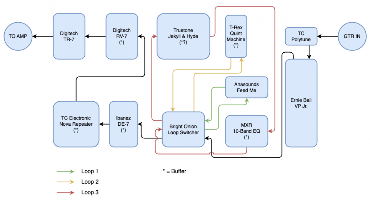 loop switcher à trois boucles fait par Bright Onion, chaque boucle contenant différentes chaines de pédales. J'ai beaucoup de problèmes de bruit qui sont un cauchemar à résoudre.