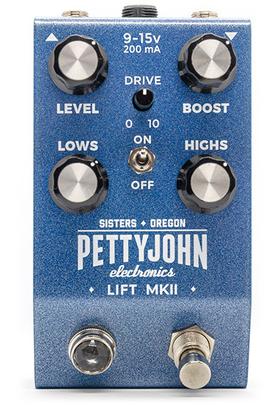 The Pettyjohn LIFT MKII operates as an always-on preamp pedal for guitar or bass, switchable between Buffer and Boost modes.