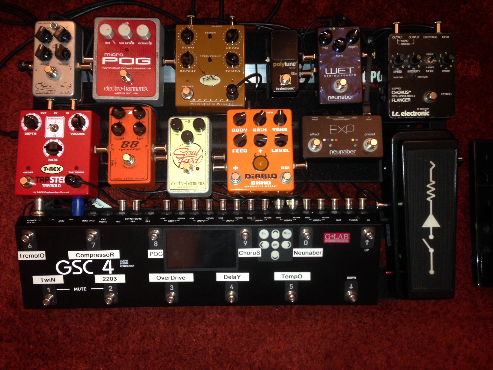 Sur mon PB, car c'est le sujet, il ya une Mooer Funky Monkey, bientôt remplacée par une Carl Marin Optical enveloppe, une Lovepedal OD eleven, une Pulsar, un delay analogique Joyo