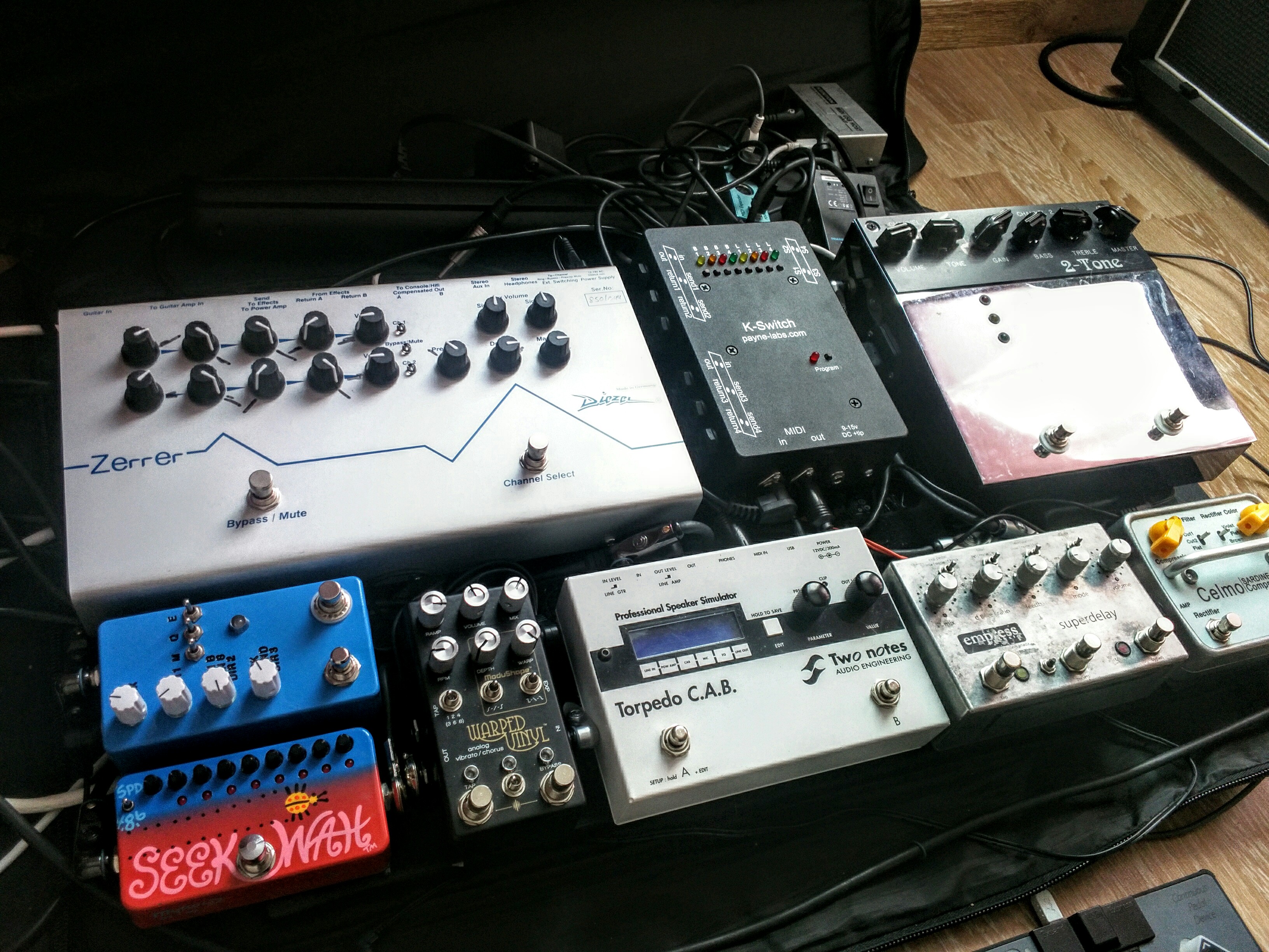Une infinité de possibilités aux pieds, sans compter les "sucreries" autour (empress superdelay, count to five, celmo sardine can, warped vinyl, et zvex seek wah)