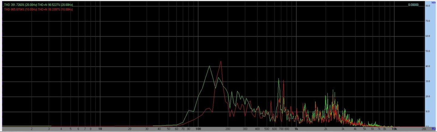 On voit bien la bosse des basses entre 250Hz et 100Hz, en dessous de 70Hz il n'y a quasiment plus rien, entre 300Hz et 600Hz on a une creusement avec une nette reprise de 600hz à 800Hz, ça creuse vers 1k5 même si il y a quelques pics d'harmoniques qui ressortent légèrement, ça remonte entre 2 et 3kHz et puis au dessus de 5kHz il ne reste quasiment rien, on atteint même pas le 5dB, je ne pense pas que quiconque puisse entendre ça au milieux de tout un tas de fréquences qui sont supérieures pour certaines d'une quarantaine de dB.