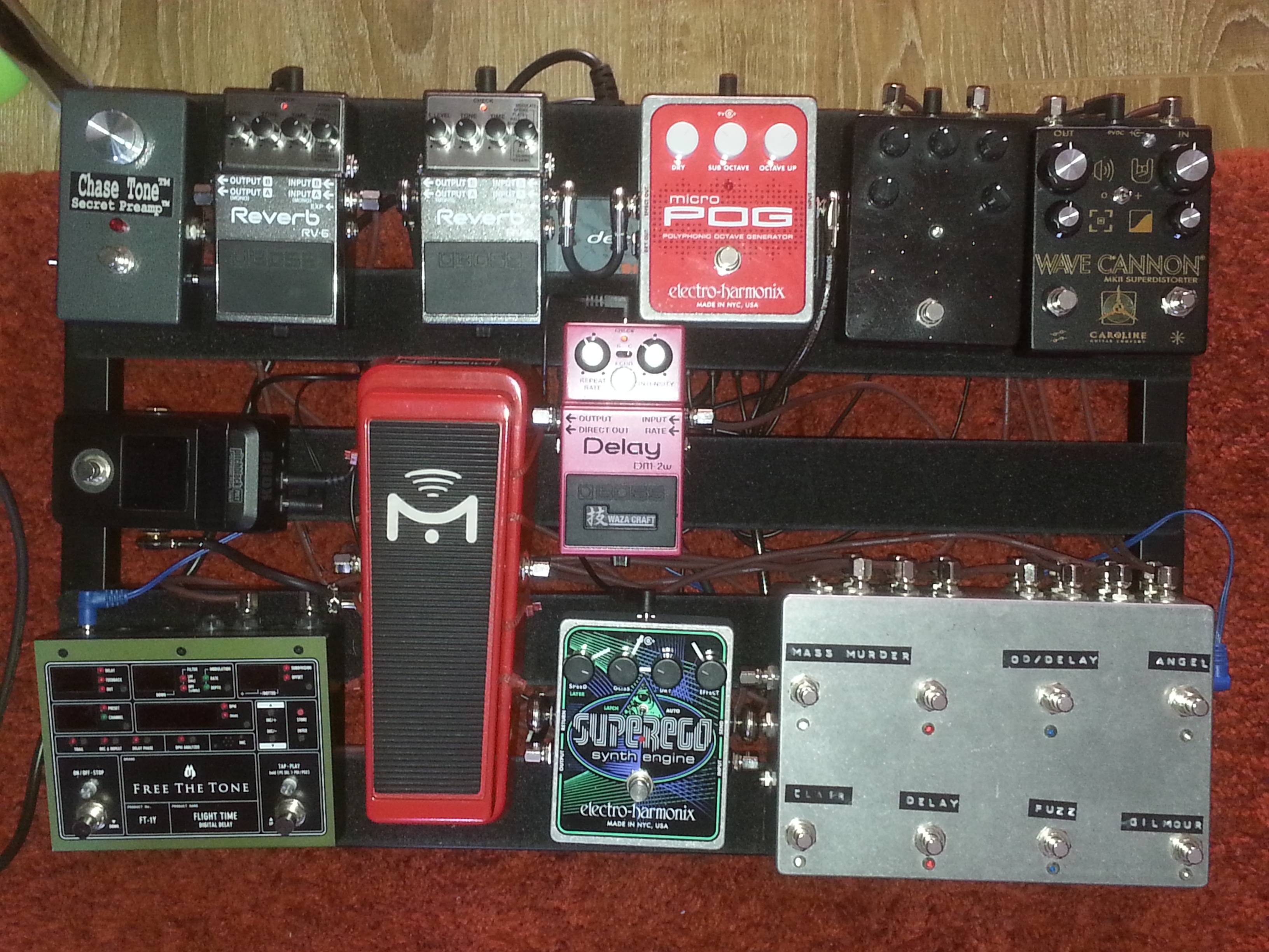 wave cannon (obligé de le mettre en premier sinon le footswich "havoc" fait pas son bordel quand t'appuie dessus.. problème d'impédance ou que sais je) -> superego (avec dans sa boucle le pog et une rv6 en mode shimmer) -> black forest (qui est un overdrive/fuzz, et qui va peut être se faire remplacer par une smallsound/bigsound mini, quand elle arrivera) -> dm2wazaaaaaaAaaAaAa -> flight time -> rv6 (en mode modulation ou dynamic, ca dépend des jours) -> secret preamp