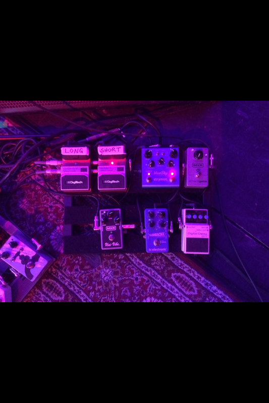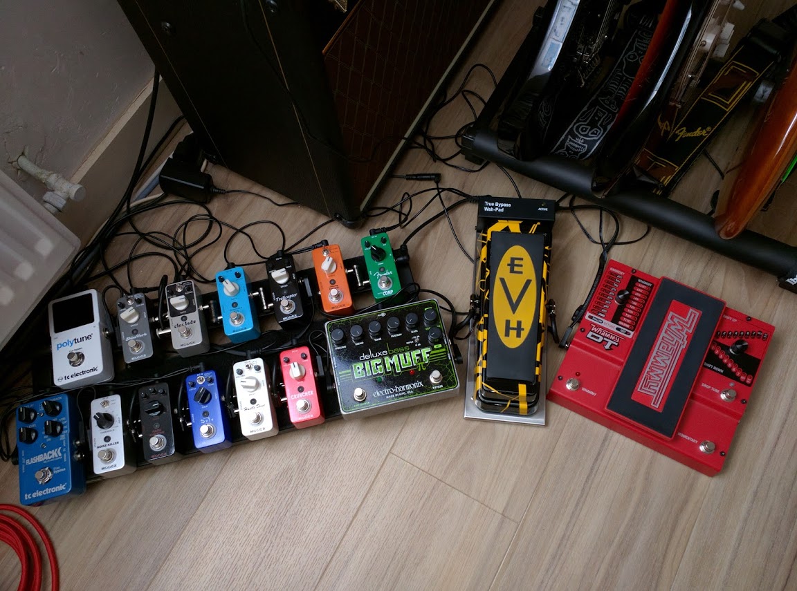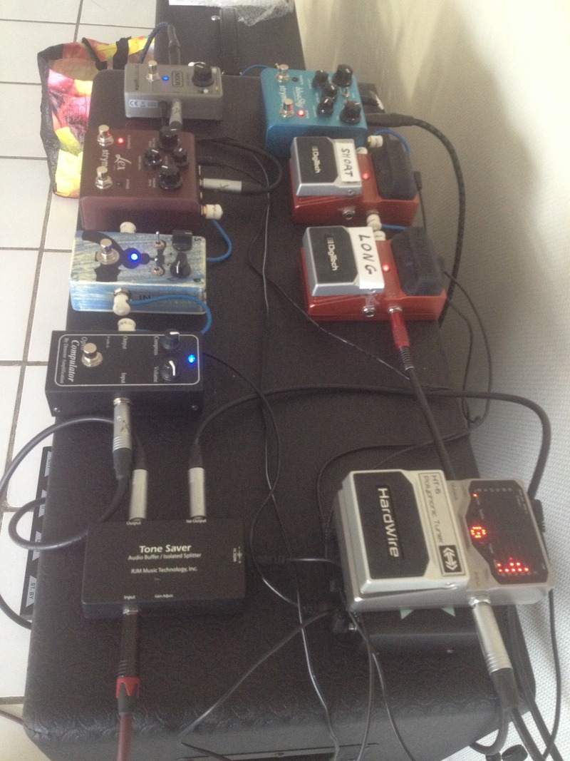 C'est vrai que pour plus de cohérence j'aurais du avoir des TC Electronic mini et autre chose à la place de l'énorme EHX... mais il y a quelques mois j'utilisais encore plusieurs pédales Boss donc c'était moins choquant.
