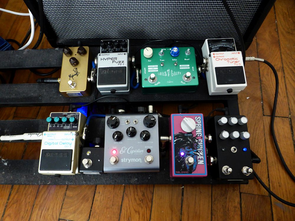 Il y a donc : Boss tuner (marche bien, costaud, et avec un buffer : que demande le peuple), Caline CP20 (clone de Fulldrive à pas cher), Boss Hyper Fuzz FZ2 (bien violent, grosse fuzz pour des effets "mur de son"), clone de Klon par moi, qui a remplacé ma Soul Food (ça sonne bien mieux dans les gros niveaux de gain), le tremolo avec tap tempo que j'ai conçu (il est top, petit format, plein d'ondes différentes, le tap tempo est génial pour combiner avec un delay par exemple), Spring Chicken pour la Reverb (super réverb à ressort, je l'ai depuis 4 ans!), Strymon El Capistan (avec Favorite switch fait par moi) : fait delay, mais aussi chorus de temps à autre et looper un peu chelou, Boss DD2 pour des delay bien clean.