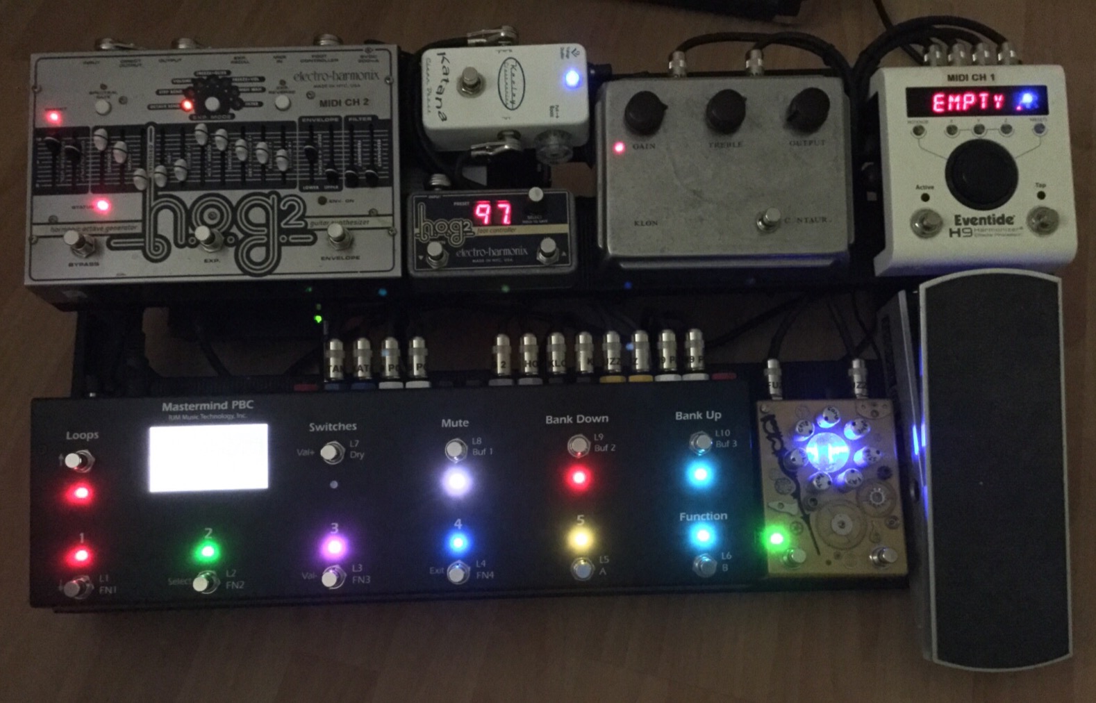 Le Hog 2, le H9 et le mini amp gizmo sont midifiés et c'est que du bonheur ! le mastermind est une boucherie (il me sert aussi d'accordeur et sera pas mal comme guirlande au pied du sapin pour Noël) avec tellement de possibilités que je n'utilise pas... Function switch pour les canaux d'amplis ou de pédales, loop stéreos, 2 outputs amplis, 3 buffers... avec au passage un grand merci à Rivera qui m'a bien aidé pour le coup !