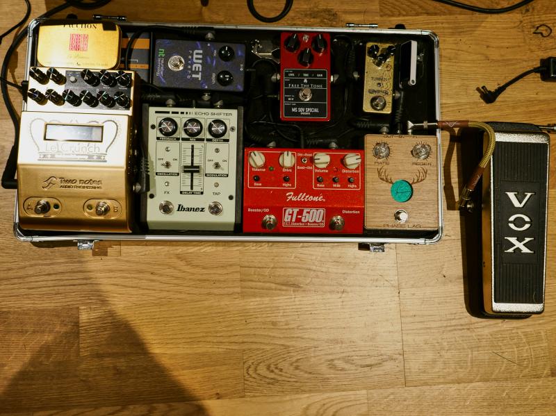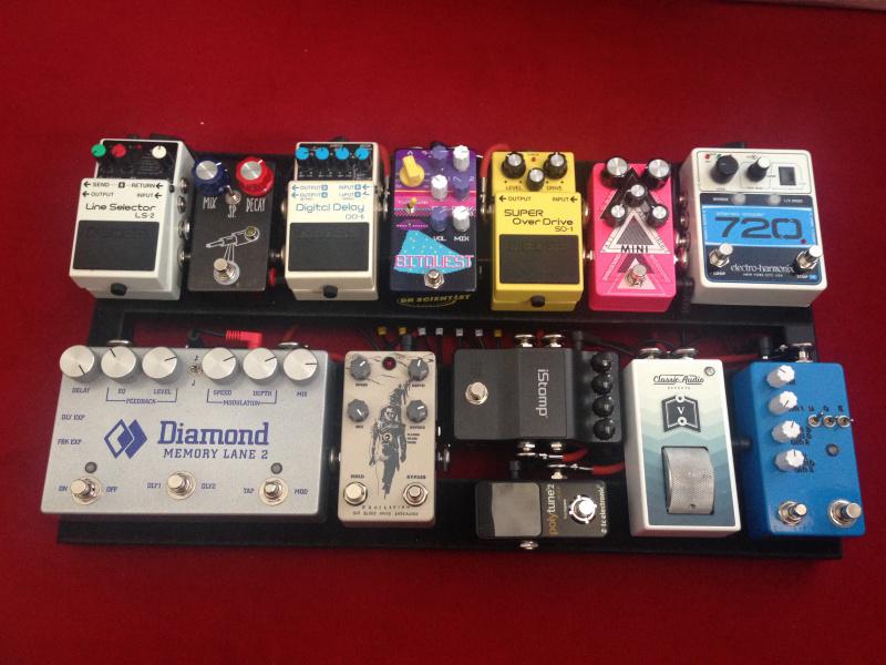 EHX 720 -> CT5 -> Volume Roller -> iStomp (vibrato et polytune sur 2ème sortie) -> Mini -> SD-1 -> Bitquest -> DD-6 -> Procession -> DML2 -> Little Gazer -> LS-2 (AB box)