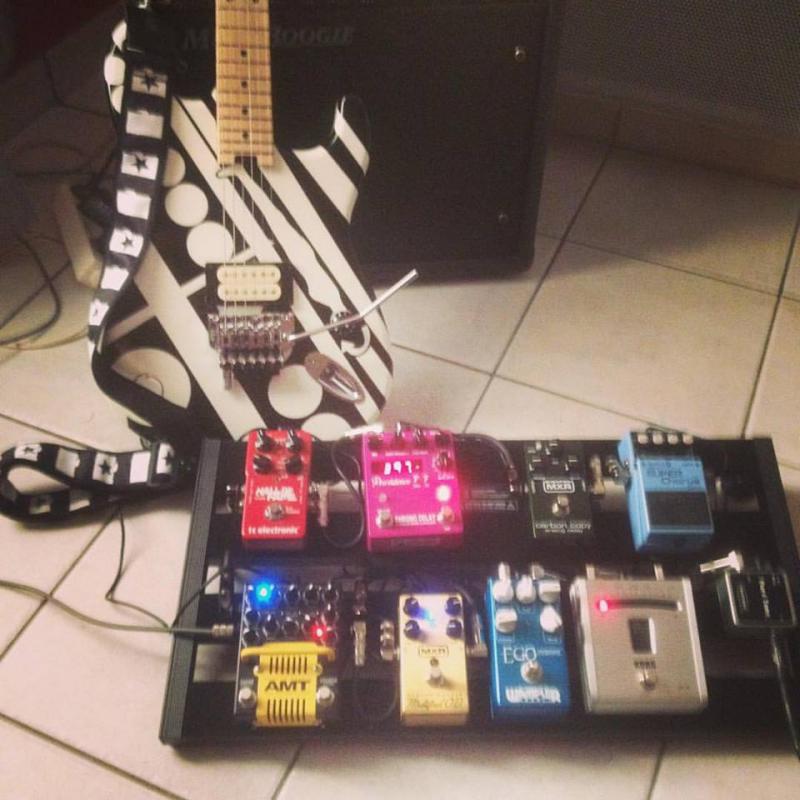 Dans l'ordre il ya en façade: accordeur, wah, octaver, harmonist (utilisée essentiellement comme whammy!), EQD dirt transmitter (fuzz) et EP booster, et dans la boucle: GE-7, delay, et le zoom MS-50 (pour delay avec tap, reverb, flanger et phaser) dans la boucle de la LS-2.