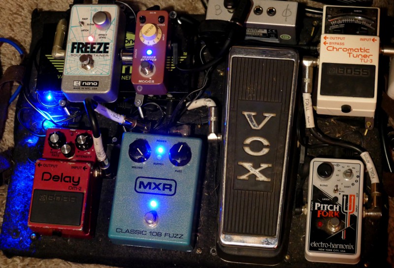 --> signal 1 = EHX pitchfork (qui me sert à simuler la guitare) --> Wah Vox --> MXR fuzz (boost) --> Boss DM-2 --> Orange Rockerverb 50.