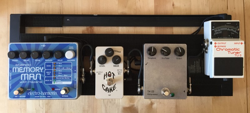 Les Paul > Polytune Mini > Crowther Hot Cake > JHS Superbolt > Black Forest > Boss DD 500