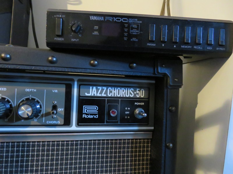 Aujourd'hui je joue en stereo, avec la sortie de la R100 cablée sur le JC-50 "bright d'un côté et l'Ampeg GVT-15H + Vox NT 212 de l'autre. C'est juste dément la façon dont les deux amplis se complètent.