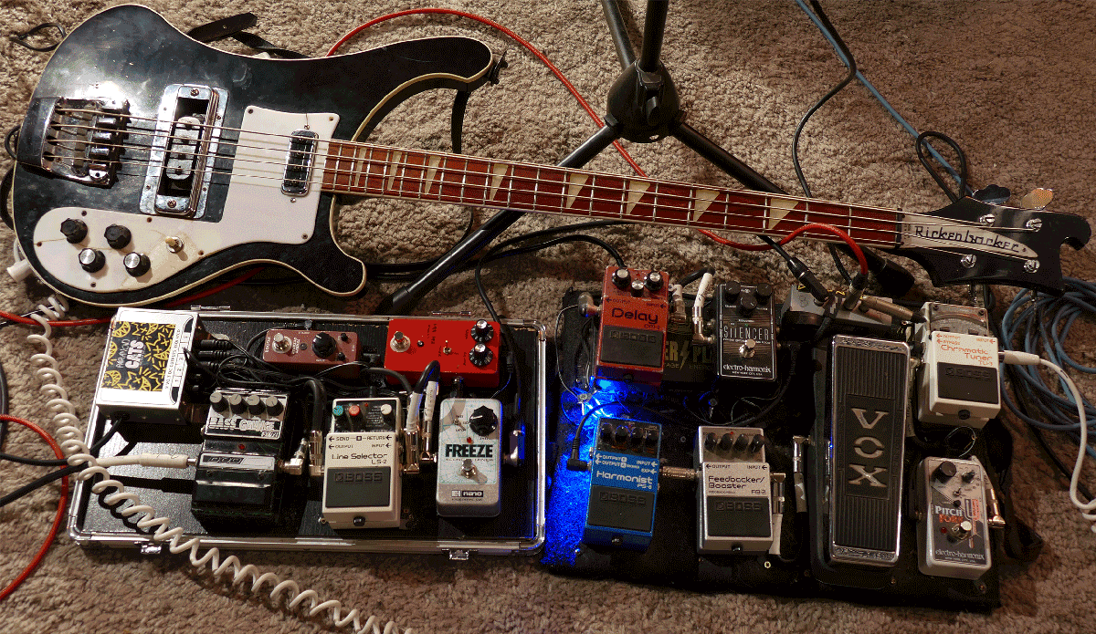 1er signal (qui part dans le Rockerverb) : EHX Pitchfork (qui me monte d'une octave pour simuler la guitare) --> Wah VoxV847 --> Boss FB-2 --> Boss PS-6 (qui me sert de whammy) --> EHX Silencer (ma Rick est bruyante) --> Boss DM-2 (delay en façade du rockerverb, c'est crade juste comme il faut !)