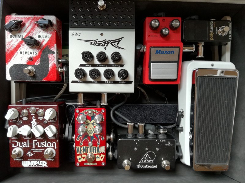 J'ai actuellement un autre chat à fouetter qui est ... mon pedalboard. Il est à peu près dans l'état de celui de Zepot. J'ai voulu revenir sur la distorsion d'ampli, "rackiser" mes effets restants en prenant un looper-switcher midi pour tout mettre dans la boucle, virer toutes mes boost-OD-compression en amont et jouer la dynamique au volume. Mais une petite série de concerts approche et je ne suis pas du tout au point. Je suis resté en mode expérimentation trop longtemps, ça prend toujours beaucoup plus de temps que l'on avait prévu (surtout les vacances d'été).