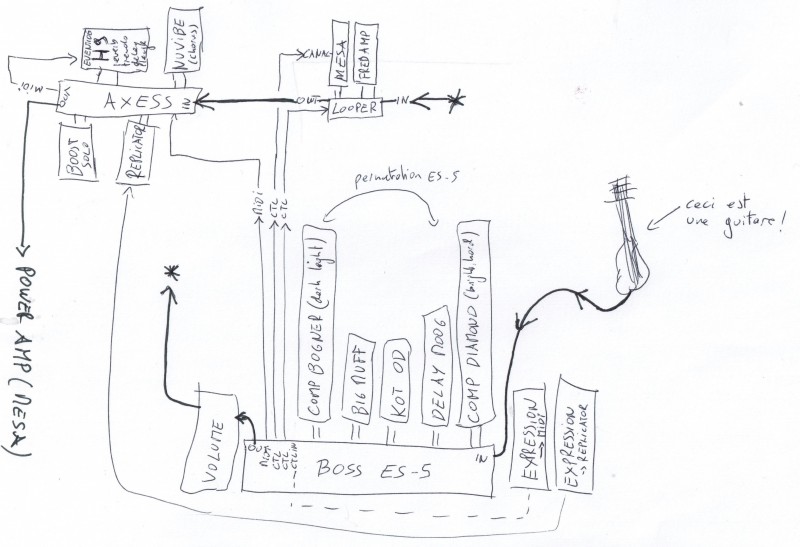 Sinon mon projet s'est simplifié. Fusion en un seul PB, je vire toutes les distorsions, j'utilise la disto de l'ampli, dans une boucle du es-5. Puis je fais l'aller retour (je déteste) pour les effets de boucle. Mais virer le maximum entre la guitare et l'ampli est le seul moyen que j'ai trouvé pour avoir un son «rapide». Comme le preampli est dans la boucle du es-5, je peux placer en réalité l'ampli où je veux dans mon rig. J'utilise mon looper brightonion pour ajouter deux boucles et je revends mon axess... ou l'inverse. Et l'ampli ne sera vraisemblablement plus le boogie