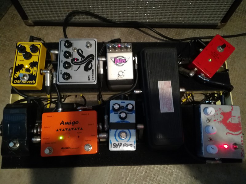 - et surtout, arrivée d'un DMM big box en lieu et place du DMMTT original avec Secret Preamp dans sa boucle. En termes de répétitions ça se vaut, mais la modulation de la big box est simplement magique, et je n'ai pas vraiment besoin du tap tempo dans mon set, ni d'un temps de delay plus long que ce que le DMM donne (au passage, je pense que mon DMM est sous la barre des 550 ms, plus proche des 450 à mon avis).
