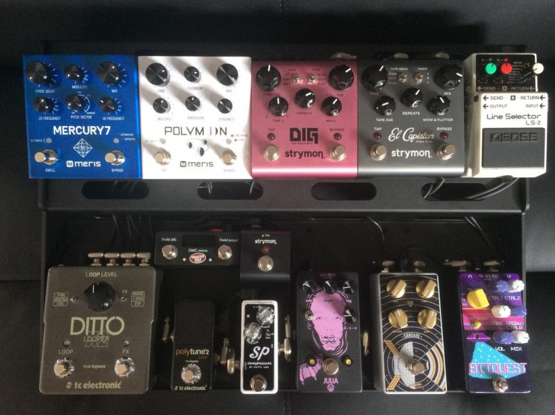 - Polymoon: je pensais au début que je garderai pas forcément la DIG car elle peut faire delay rythmique assez "basique", enfin épuré (même si pas toutes les subdivisons de la DIG (ce qui fait que je la garde). C'est surtout une énorme machine à nappe. Elle a pour elle l'avantage de faire d'énormes pads à elle toute seule là où il faudrait 3 ou 4 pédales classiques (au moins une modulation, 1 ou 2 delays et une réverb voire un pitch en plus). Y a un flanger (utilisable en stand-alone si potard de mix à 0), un phaser moins paramétrable mais qu'on peut synchroniser au rythme du delay, une fonction cachée qui amène les effets de pitch/ring mod dont j'ai pas encore eu le temps de faire le tour et donc les potards multiply et dimension qui sont spécifiques à ce delay, multiply qui multiplie donc le nombre de répétitions dans l'intervalle du tempo et dimension qui va faire un peu l'effet reverb en noyant les répétitions qui vont devenir de moins en moins audible.