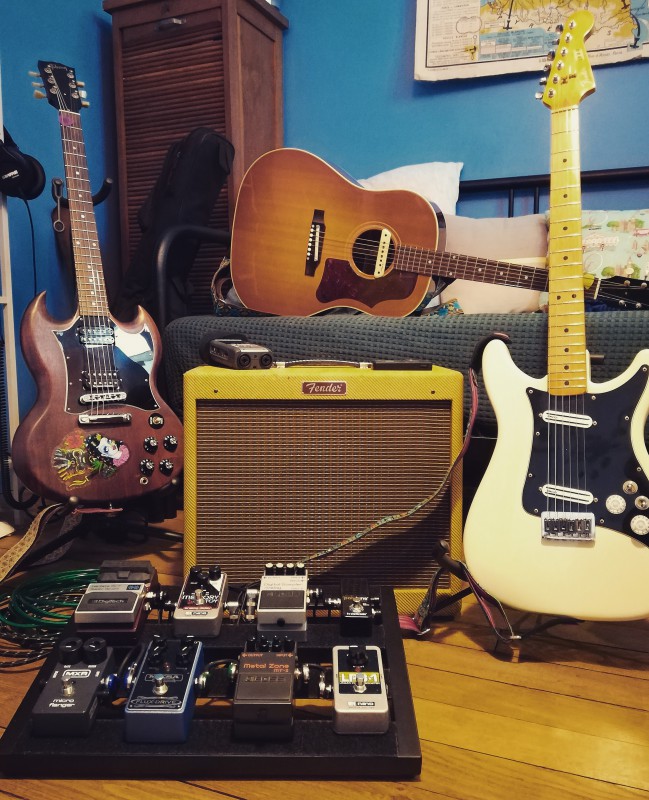 J’envoie tout ça en front de 2 amplis (typé British en EL84) réglés en clean légèrement sale / chimy ce qui me permet d’avoir le clipping des drive qui se mélange a celui des amplis. Ça change tout par rapport à des amplis 100% clean que j’utilisais auparavant.