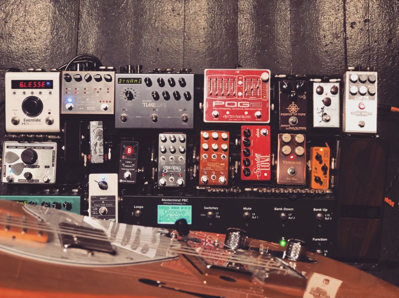 Tous les morceaux sont programmés dans le RJM PBC, au tempo, avec les combinaison analogique (POG2 + Overdrive + clean boost par exemple) et les combinaisons des pédales numériques (Timeline on/preset 22 + Bigsky off + AmbiSpace preset 2 Hall par exemple).