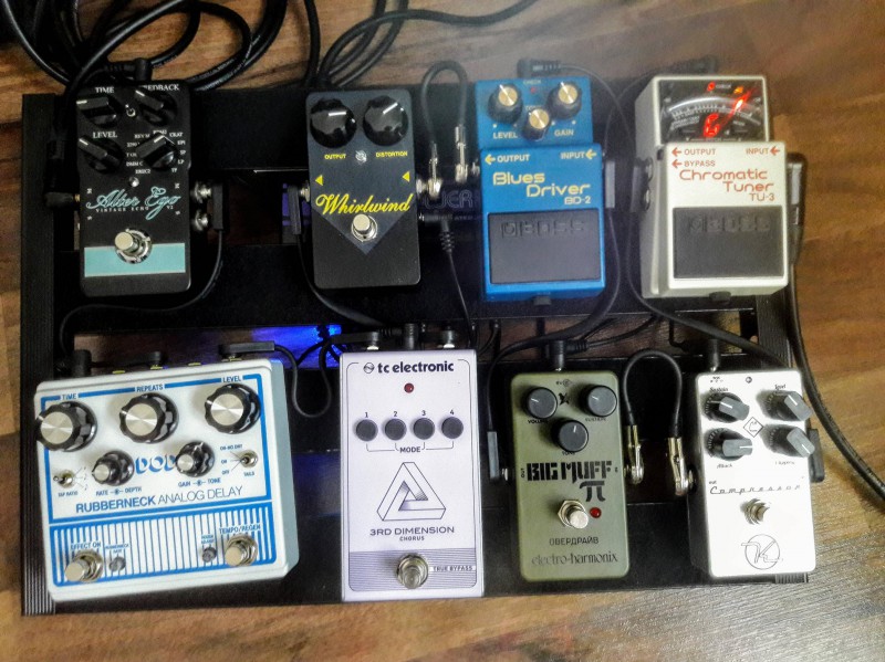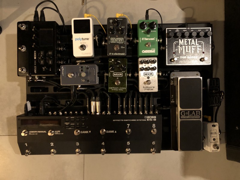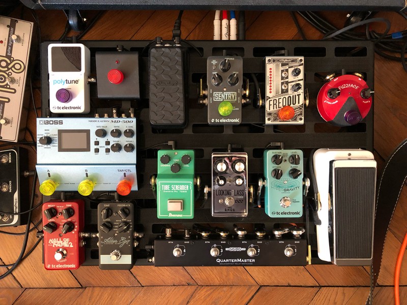 Chainage relativement simple : Guitare => Buffer (tc electronic BonaFide Buffer) => looper (Mooer Micro Looper ) => Wha (G Lab Wowee-Wah) => Boss ES-8