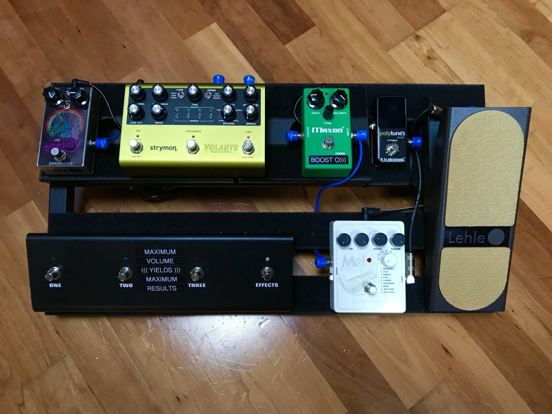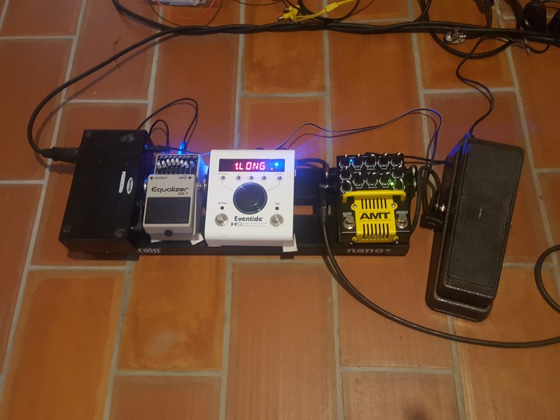 En bref, l'AMT SS11B est le coeur de la config, il n'est jamais éteint. Le GE-7 et le H9 sont dans la boucle du preamp. Ils sont positionnés dans l'autre sens afin que je puisse enclencher l'EQ et le delay du H9 en même temps pour les solos. Testé pour l'instant dans mes monitos, mais aussi dans le return de la Power Station utilisée en PA sur un 2x12 closed en Creambacks H75, ça envoie du bois.