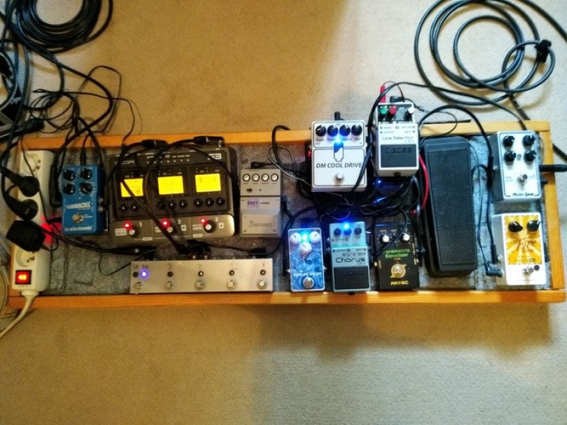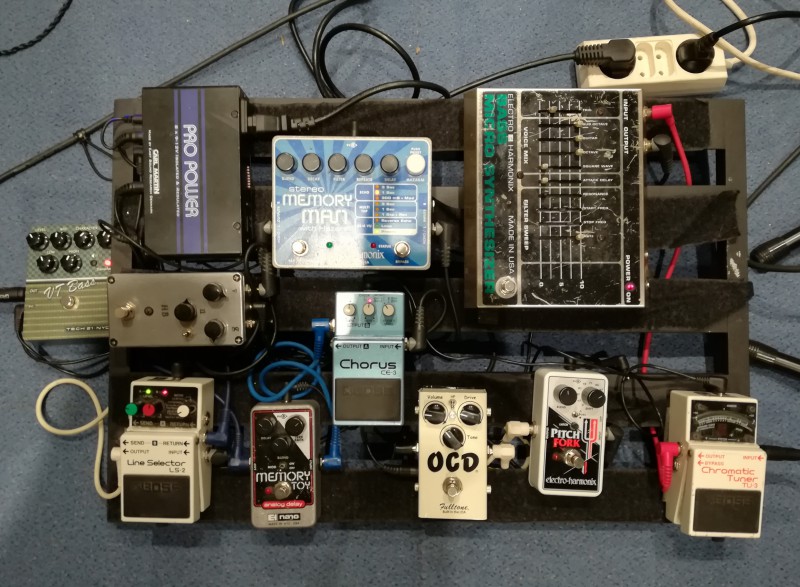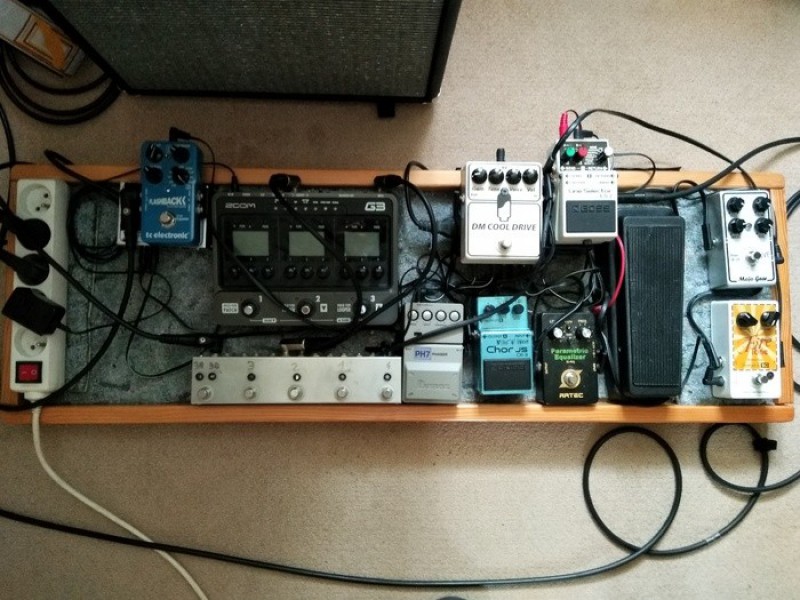Canal 1 : Clone d'Octavia (BO Effects Fire Tone), Wha (Crybaby GCB95), Artec Para EQ (clean boost), clone Zendrive (Denis Manlay Cool Drive), Boss CE-3 mod MSM (utilisé comme vibrato), Delay analogique (le petit nouveau ^^), Phaser (Ibanez PH7), delay numérique (TC Flashback delay) >>> Fender Superchamp XD réglé en clean.