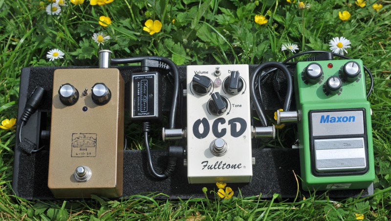 C'est ma config' pour la maison ou pour aller taper le boeuf en ville. Ça prend pas de place et c'est tout léger. En plus, la housse du PedalTrain a un système de sangles qui permet de l'accrocher à la housse de la gratte.
