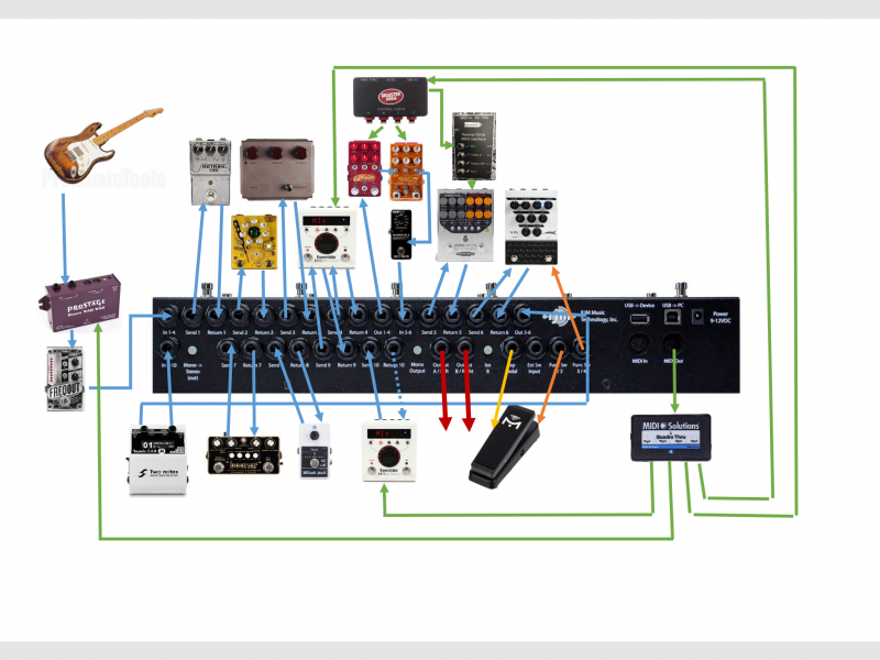 Les Câbles c’est du Evidence Audio SIS en Solderless. A part pour les loops 7-10 du RJM qui nécessitent des câbles spécifiques si on utilise une ou plusieurs pédales en Stéréo.