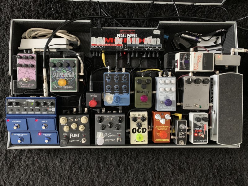La seule variante, c'est le remplacement de temps en temps de la Earthquaker Transmisser (en haut à gauche) par une Boss PS-2. Elles sont situées dans la boucle du SuperEgo pour des nappes ou des bruits/glitchs pour tester et garder au chaud dans le Jamman.