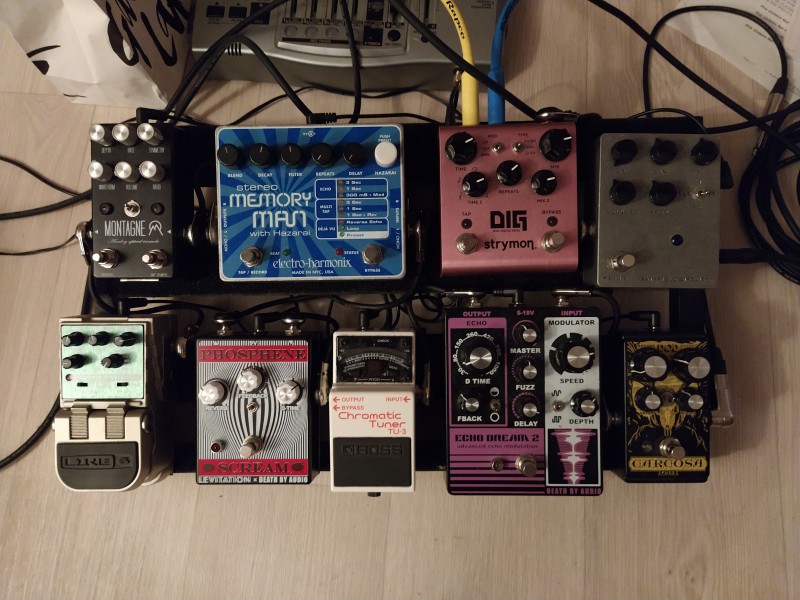 Dernière mouture en date de mon pedalboard branché dans un jmp1 lui même branché dans un Tube Works mosvalve 962.