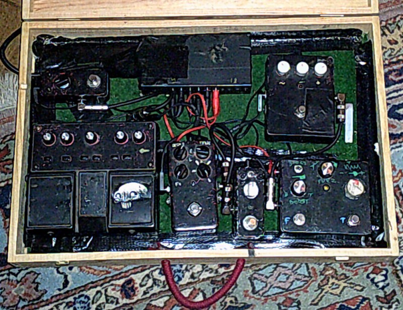 J'aime bien, on ne voit plus beaucoup ces vieilles Ibanez et Dano Question: en solo tu as besoin de 3 pédales de gain? Et au-dessus, c'est un enveloppe filter la DOD? Je ne vois pas bien.