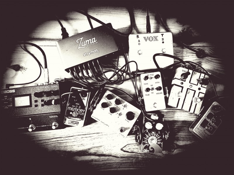 Le tout arrive dans une EHX Memory Toy dont j'ai eu le bon sens de foutre en l'air en tournant les trimpots internes du gain des puces. Enclenchée avec le blend à zéro, c'est un fantastique mid-boost dont je ne saurais pas me passer lorsque je joue à bas volume : je fais partie de ces imbeciles qui baissent le niveau de signal en entrée, ça écrase doucement les fréquences, alors je compense. Ça fait bien quinze ans que je ne l'utilise pas en tant que delay.
