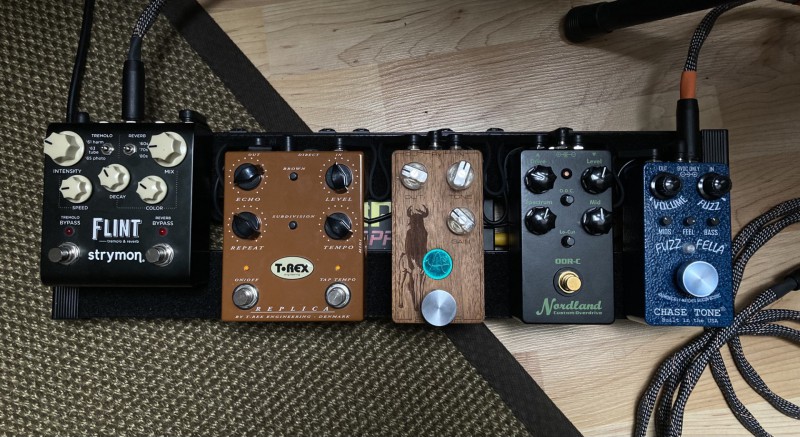 Perso j'utilise le trem et la reverb de mon ampli (super souvenir de la Flint, excellente pédale), mais sinon on est assez raccord : la Fuzz Fella dans la Nordland, ça marche bien, hein ? On a quasiment le même réglage sur la Nordland d'ailleurs. Un od léger derrière (je ne sais plus si j'ai essayé mon Centura après l'ODR-C, mais j'aime beacoup la Lighspedd) et une touche de delay numérique mais voicé analog et on est bien !