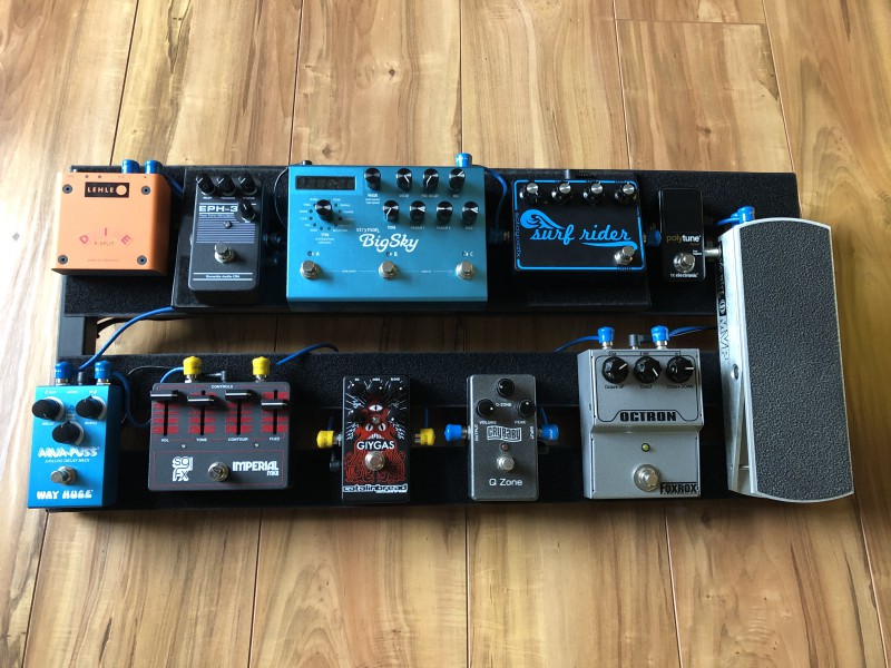 On peut se poser la question des doublons sur les effets delay / réverb: j’en cumule plusieurs pour avoir à la fois le trio Timeline / Volante / Bigsky en parallèle via le mixer RJM (ce qui permet d’avoir des layers d’effets d’ambiance qui se superposent et ne noient pas l’attaque des notes) et à la fois la Source Audio Collider et l’H9 en série qui me servent à casser le dry mix et noyer le son quand c’est nécessaire et aller chercher des sons un peu complexes.