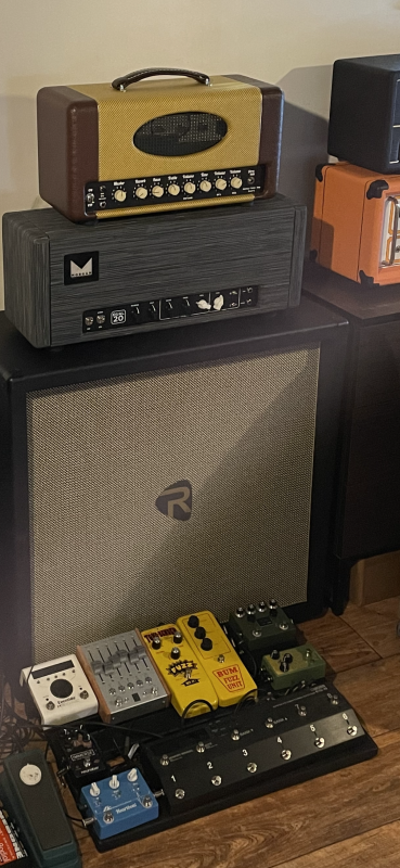 Ici, je sors sur un Deluxe/Champ fait par Oldamp sur 1x12 (une partie du cab en greenback) et le Morgan dans l'autre partie 2x12 alnico gold/v30.