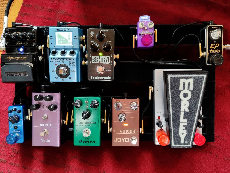- et un modèle de taille moyenne, axé guitare, avec le classique EP booster en entrée, suivi du mini OCTA dont la position 1 est une parfaite émulation de l'antique Boss OC-2 que j'adore (j'ai l'original); ensuite la Morley Wha-fuzz, suivie de la Tauren (Klon-like), une tube screamer 808/TS9 (je dois encore voir si je mets ma Maxon à la place ou pas), la Fender The Pelt qui est une excellente fuzz polyvalente, un petit multi-modulation Donner bien pratique pour les gens qui comme moi n'utilisent que très rarement des modulations. A ce stade, on a le choix, soit on sort vers l'ampli, soit on continue vers la rangée supérieure (qui peut donc aller dans la boucle aussi) avec la Sentry, le Multistomp surtout utilisé pour les delays et enfin la reverb Supernatural. L'alim est en-dessous.