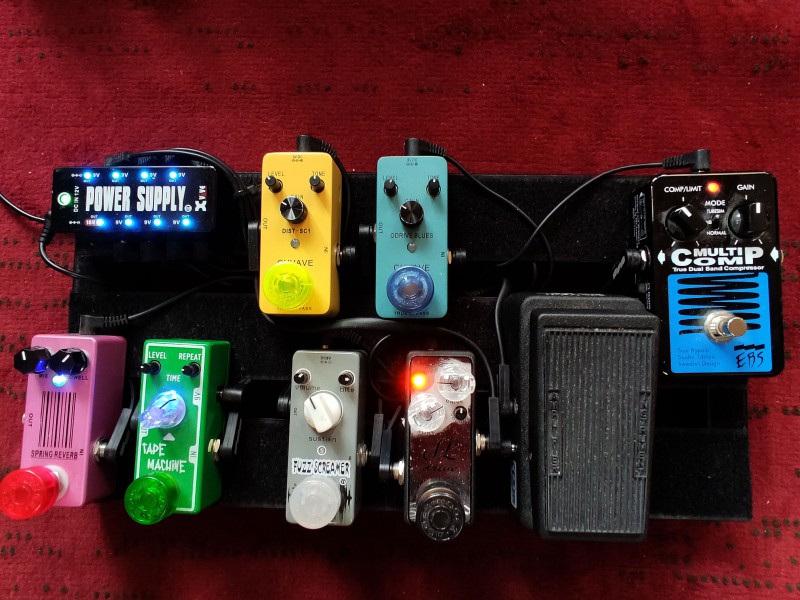 - un mini polyvalent guitare/basse: le multicomp n'est plus à présenter et fonctionne aussi bien pour basse que pour guitare (avec une position émulation lampe fantastique), no comment pour la la mini-wah, l'ODrive blues est un overdrive bluesy classique, la dist-SC1 est entre la fuzz et la distortion, la SL Drive est réglée en mode Superbass, et la Fuzz screamer est une fuzz bien grasse du type Fuzzface qui fonctionne étonamment bien avec une basse; plus les classiques écho (émulation tape digitale) et reverb spring; un petit pédalier très pratique, peu encombrant, léger et très clean en son
