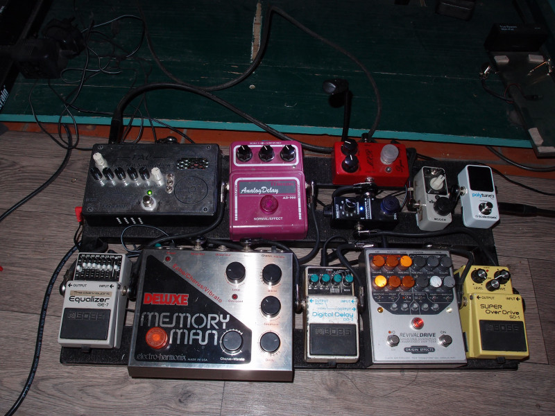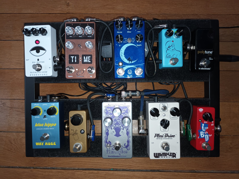 Ajout de la Red Witch Eve Tremolo, une pédale au son absolument délicieux, l'un des tremolo les plus doux que j'ai essayé. Seul défaut de cette pédale (comme 90 % des tremolo que je connais) : le son est exploitable qu'à la fin de la course, sauf qu'ici les potards sont montés à l'envers donc c'est le début. En gros, tu mets tout au minimum, et t'as le son de mitraillette attendu d'un tremolo rapide et puis tu pars de là. Dès 9 heures on entend à peine l'onde et à 11 sur la vitesse, ça commence à devenir assez lent. Au final, on a donc un tremolo de vitesse et de profondeur normale à respectivement 10 heures et 8 heures. Allez, c'est emballé.