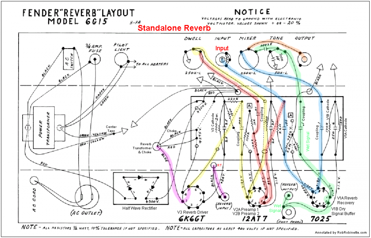 Remarque, je viens de farfouiller, l'unité de réverb indépendante modèle 6G15 n'utilise pas le même "truc" que le Twin Reverb avec les deux circuits d'une 12AT7 attaquant le transfo, mais un tube de puissance octal 6K6G