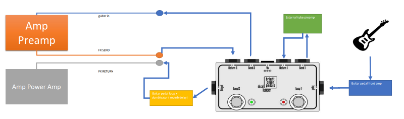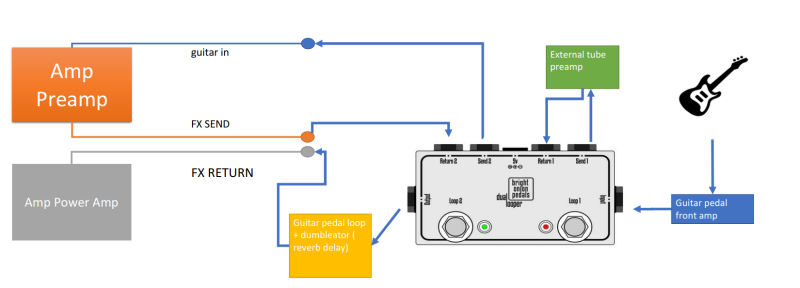 Ensuite, idéalement, si tu veux utiliser ton Fredamp alternativement et indépendament aux canaux de ton ampli, il faudra un looper double: une boucle va dans le préampli, l'autre va dans le fredamp. Bright onion fait ce genre de choses: