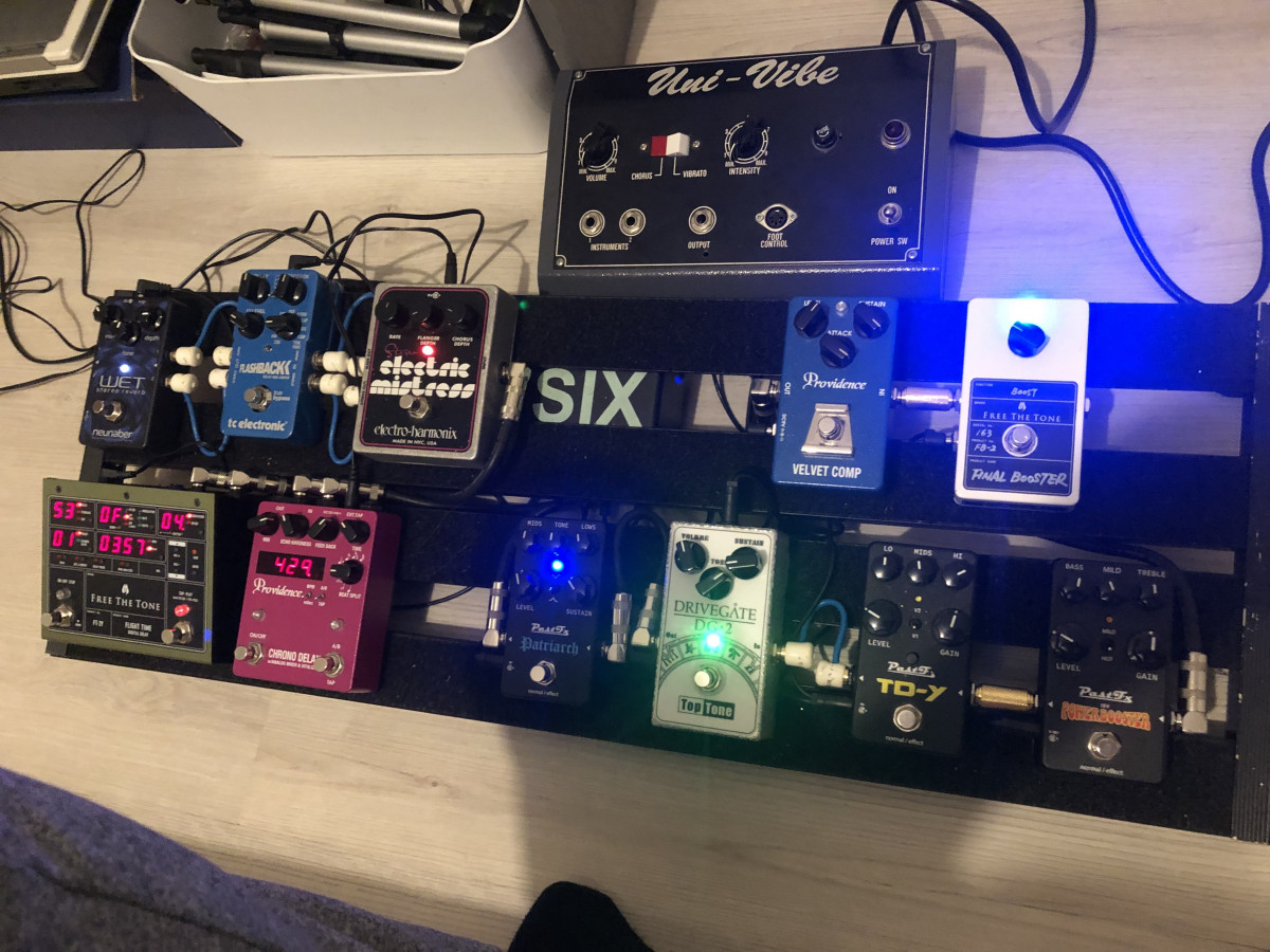 Voici le mien 2024 dans l’esprit Gilmour, j’ai choisi les Past fx et la top tone dg2 pour le son des Cornish, les delays de haute qualité (rig pomperi gilmour), la flanger mistress stereo et un booster buffer Free the tone, je me fabrique egalement un buffer cornish qui viendra également completer le pedalboard.