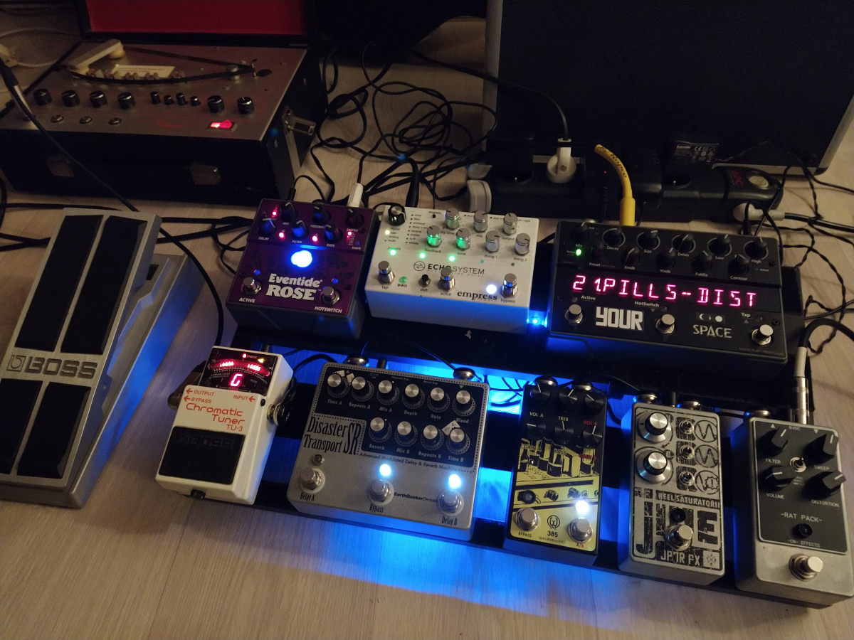 Ce pedalboard me permet de donner du gras ou au contraire d'affiner, d'aider à me balader entre les registres clean/lowgain et les registre plus high gain sur le préampli, de passer dessus ou dessous les autres.