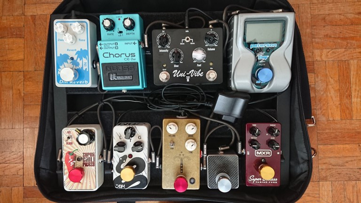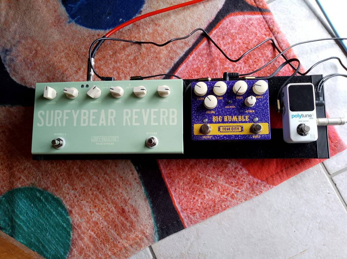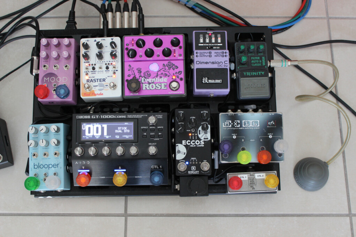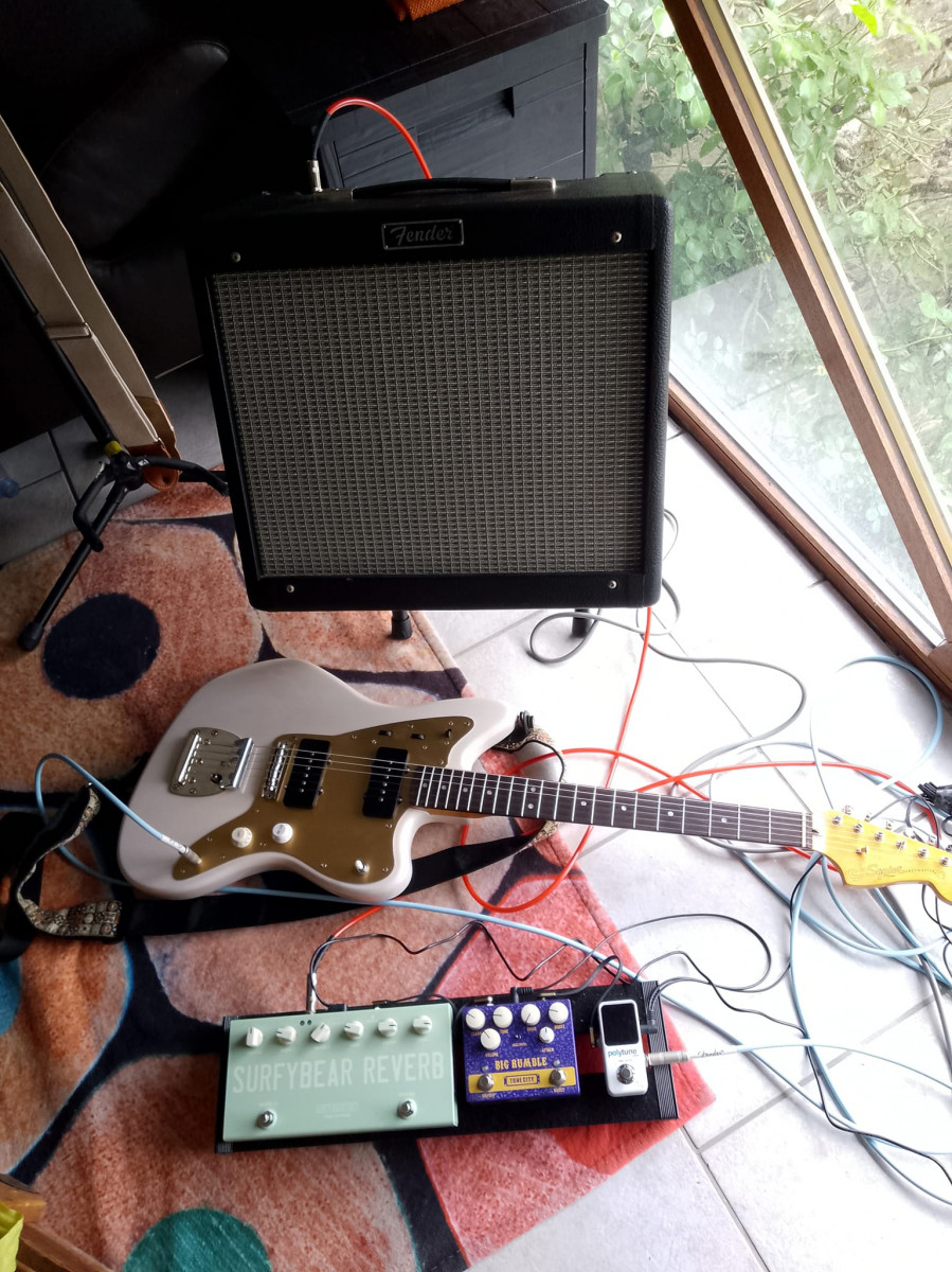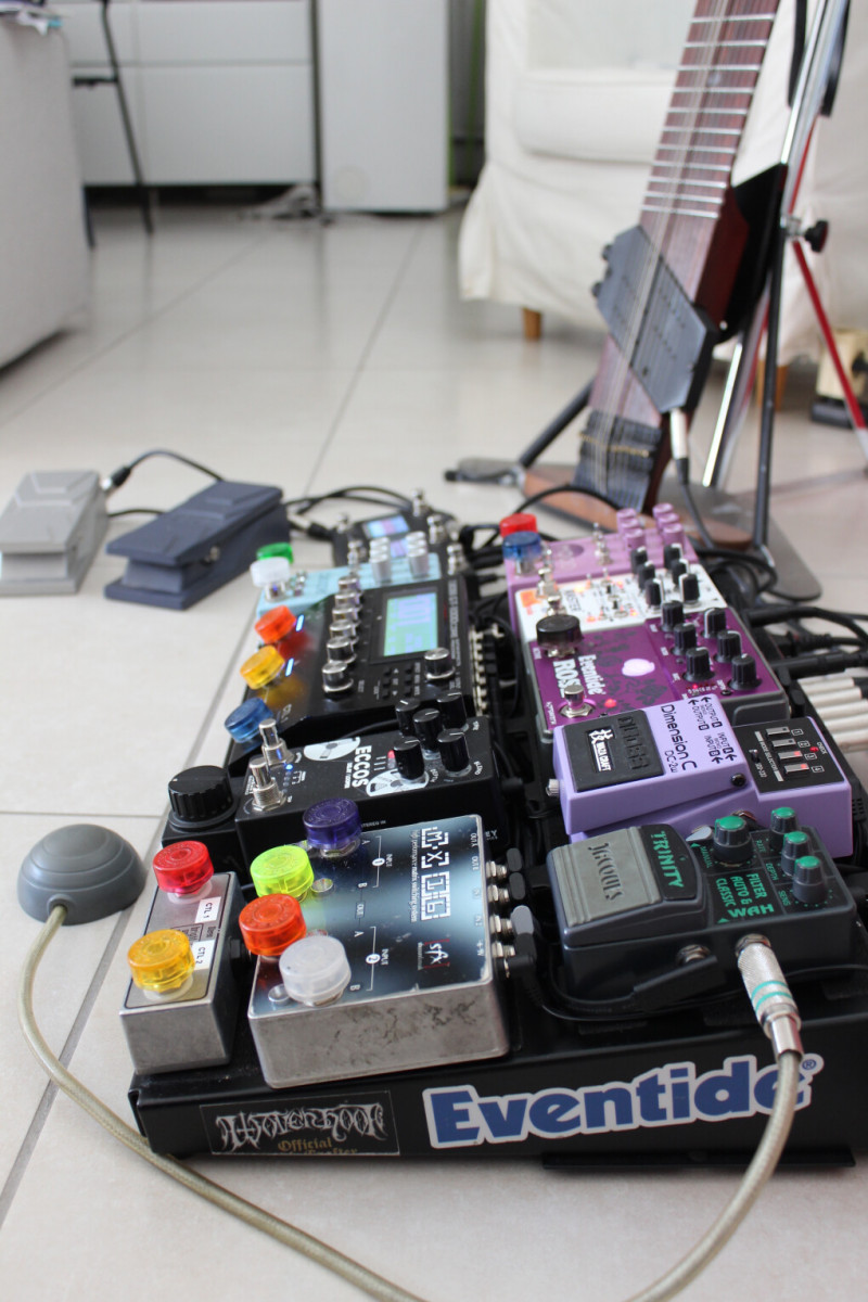 Un des avantages de cet instrument est que l'espèce de trapèze sur lequel est branché le jack est le micro, stéréo : il y a deux micros dans ce bloc, l'un pour les aigues, l'autre pour les graves. On utilise un jack TRS d'ailleurs. Ensuite, le son est traité par des effets différents. Par exemple, sur la partie aigue, je passe par le GT1000 en entrée A, la Trinity dans une boucle, puis en sortie du GT1000 sortie A, la Mood et la Keeley Eccos. Pour les cordes graves, je passe aussi par le GT1000 entrée B (en prenant une architecture interne de deux canaux en parallèle pour que les signaux ne se mélangent pas évidemment), puis la Rose dans une boucle, et ensuite, en sortie B du GT1000, j'attaque la Raster, le Blooper puis le DC-2w. Le tout rentre dans une petite table de mixage, puis dans deux enceintes Headrush 108. Ce qui est magnifique sur le plan sonore, c'est que j'ai donc 4 sorties, puisque mes deux lignes d'effets en parallèle (faut suivre hein) finissent par de la stéréo. Autant dire que le son est énorme sur scène, alors que j'ai un set aux pieds relativement restreint.