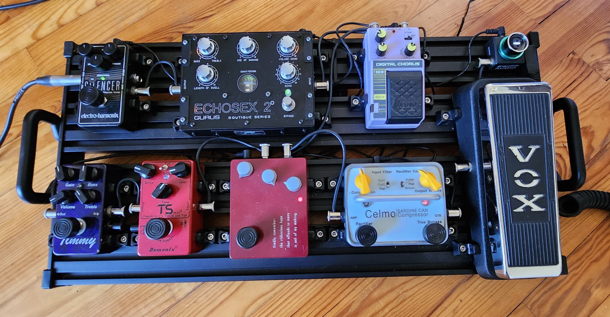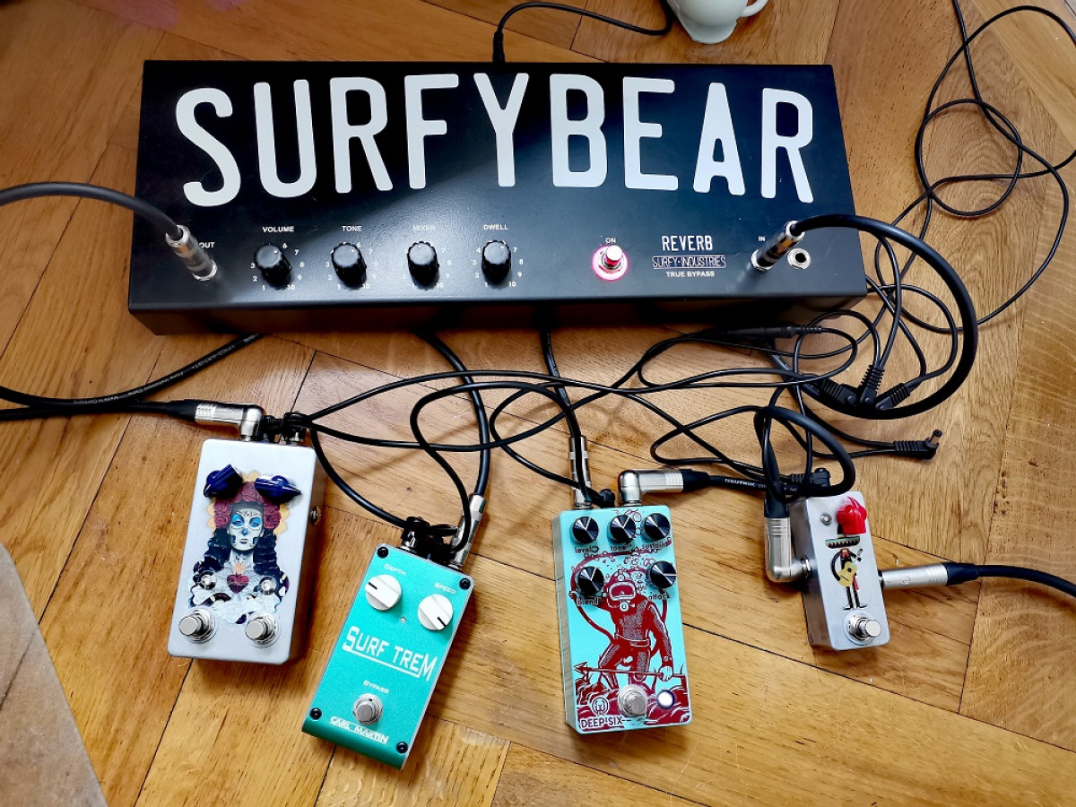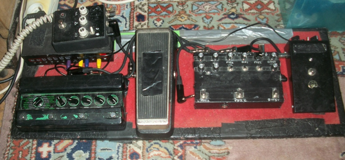 De gauche à droite et un peu en haut: Un clone DIY de Colorsound One Knob Fuzz, un compr... mais arrête DE ME FOUETTER AVEC TA CEINTURE BORDEL!... un compresseur, donc, Walrus Audio Deep Six, la sacro-sainte Surfy Bear, un tremolo Carl Martin qui porte bien son nom et, enfin, un (pas si) clean boost (que ça) et un volume treble bleed en une seule box DIY.