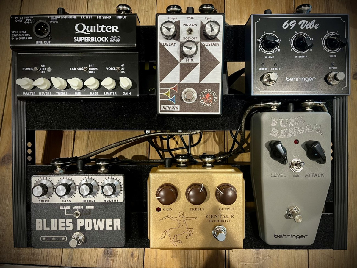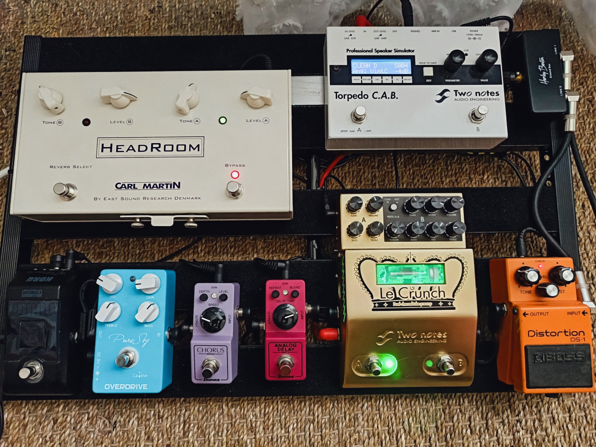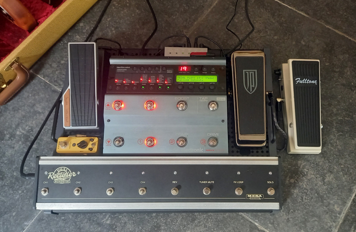 Guitares --> Fulltone Supa Wha --> Dunlop JP95 --> Mooer Acoustikar --> TC Electronic Nova System --> Fender Exp Pedal --> Mesa Boogie Roadster --> 2X12 V30.